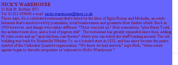 CONLON'S BAR Waring St Belfast BT1 It's probably the only old-fashioned, nicotine-stained bar that hasn't been restyled as a quaint old Irish boozer. Conlon's is unaffected and essentially come-as-you-are in style, a location that's barely been touched since it moved here from York Street in 1941 with a Blitz licence, following the German bombing. Formerly the meeting place for reporters and Communist Party members, the bar still attracts an interesting clientele, savouring the unspoilt nature of the place while it still lasts. "It's coming down soon," says the barman. "The foundations are away with it. They'll soon be turning it into a hotel bar and restaurant." Stop Press: Sadly no more, Conlon's has finally been demolished! In its place 'the Press Box,' a temporary bar solution awaiting the day when it too will be swept aside for a hotel bar and restaurant.